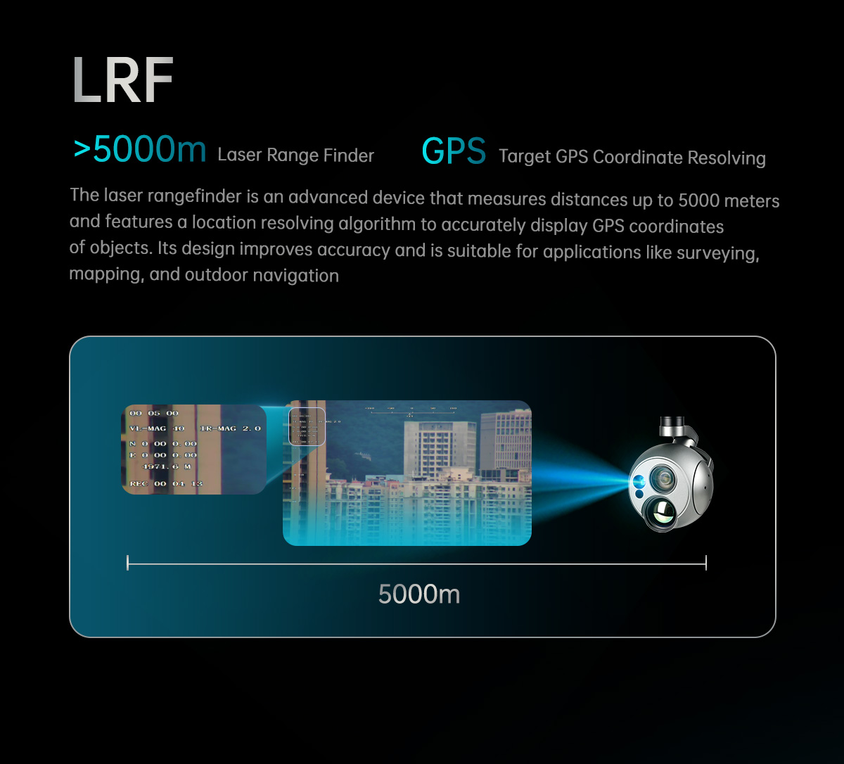 | Capacidad de medición | ≥5 km para objetivos grandes (p. ej., edificios) ≥3 km para automóviles(2,3 m×2,3 m) ≥1,5 km para personas(1,75 m×0,75 m) (Basado en valor típico: Visibilidad LOS: ≥8 km Tasa de reflexión difusa: ≥0,3 Humildad: ≤80%) |