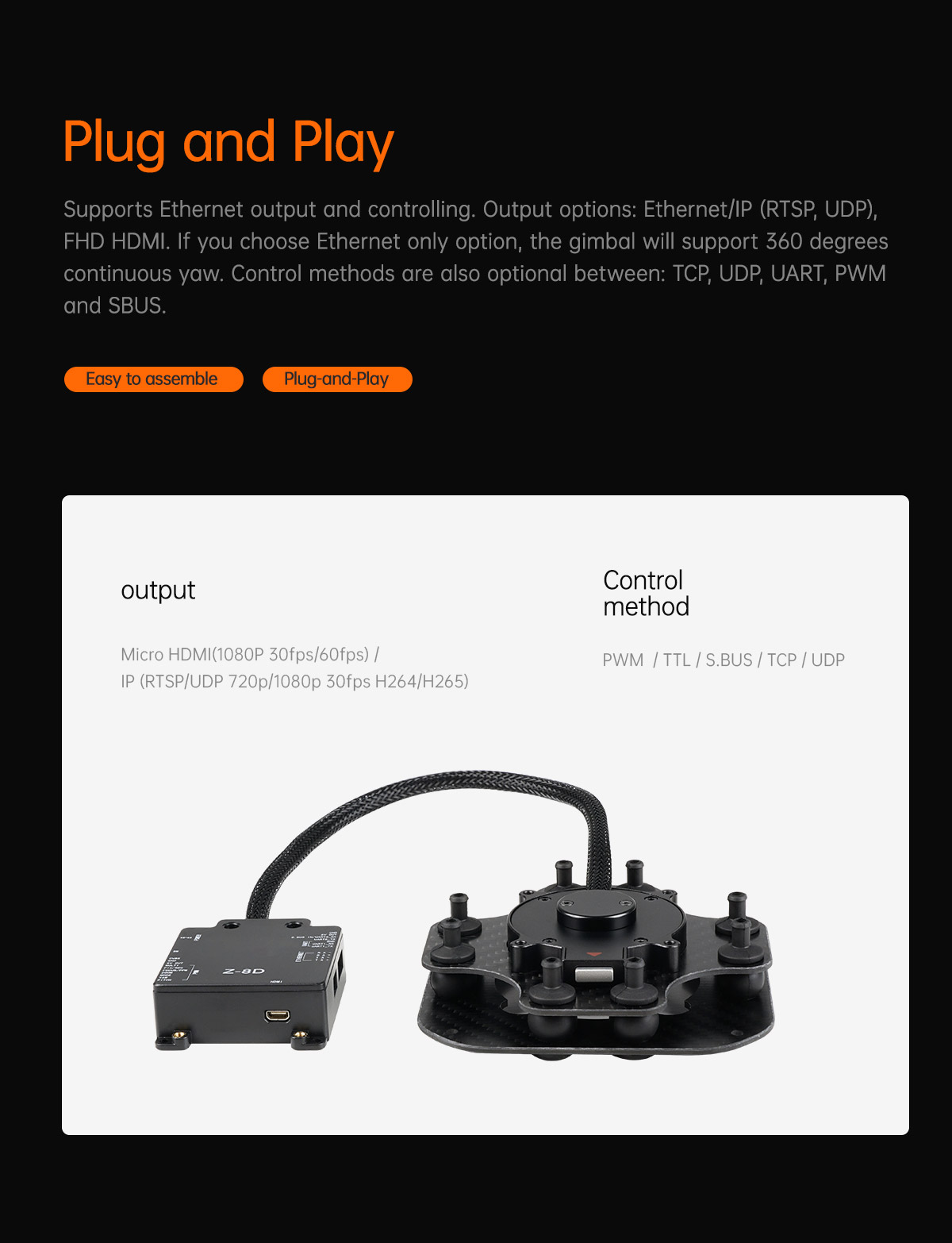| Control method | PWM / SBUS / TTL / TCP (IP output version) |