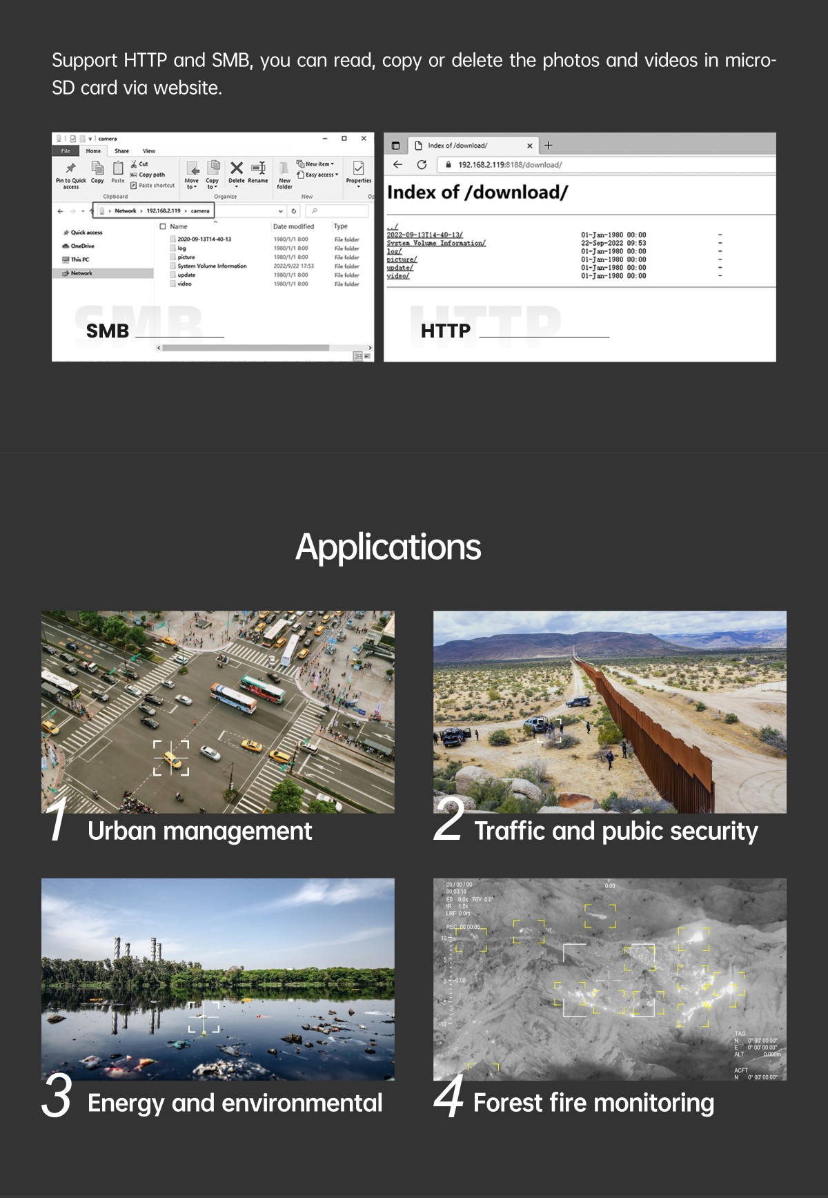 | Local-storage | TF card (Up to 256G, class 10, FAT32 format) |