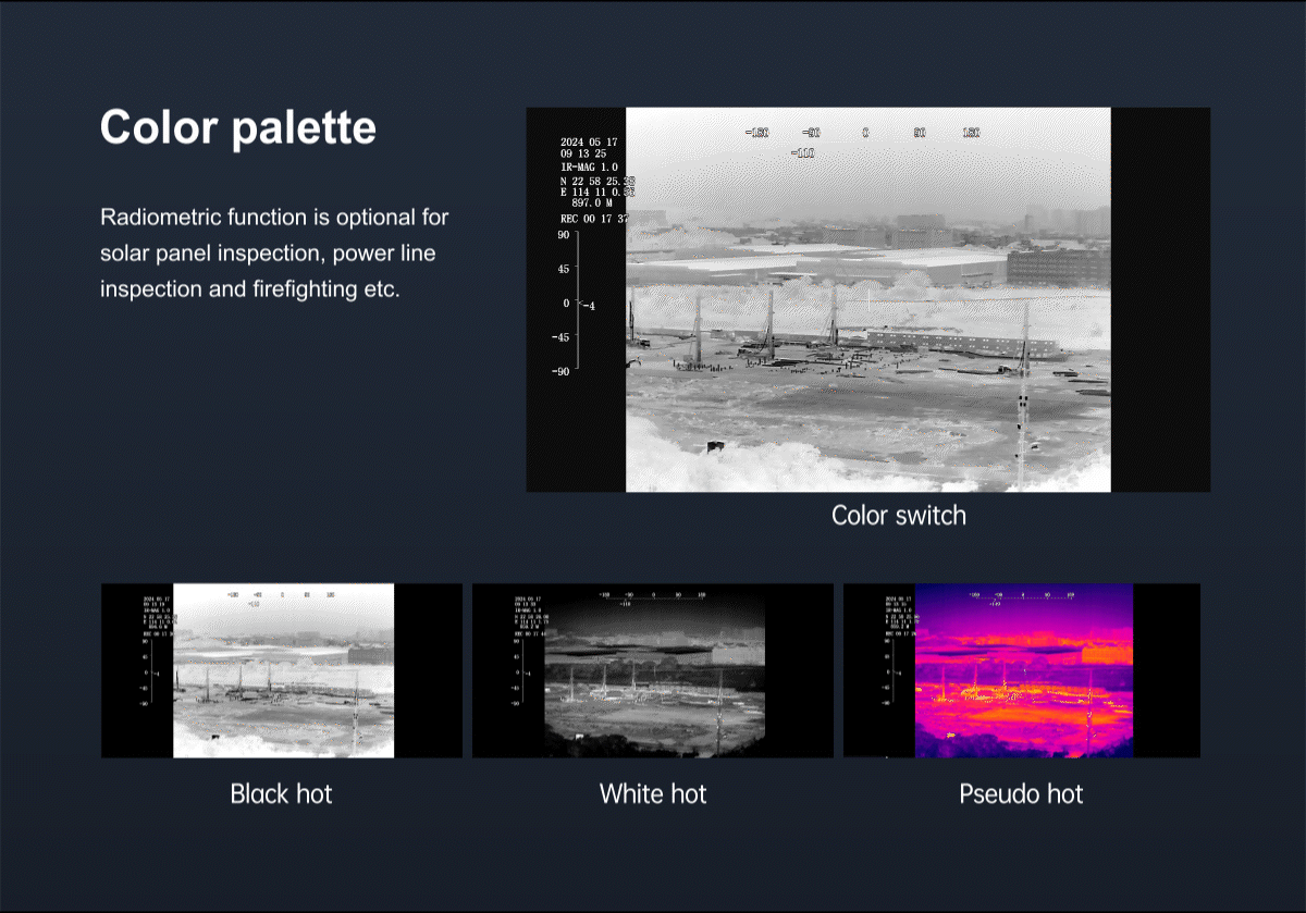 | Color palette | white hot, black hot, pseudo color |