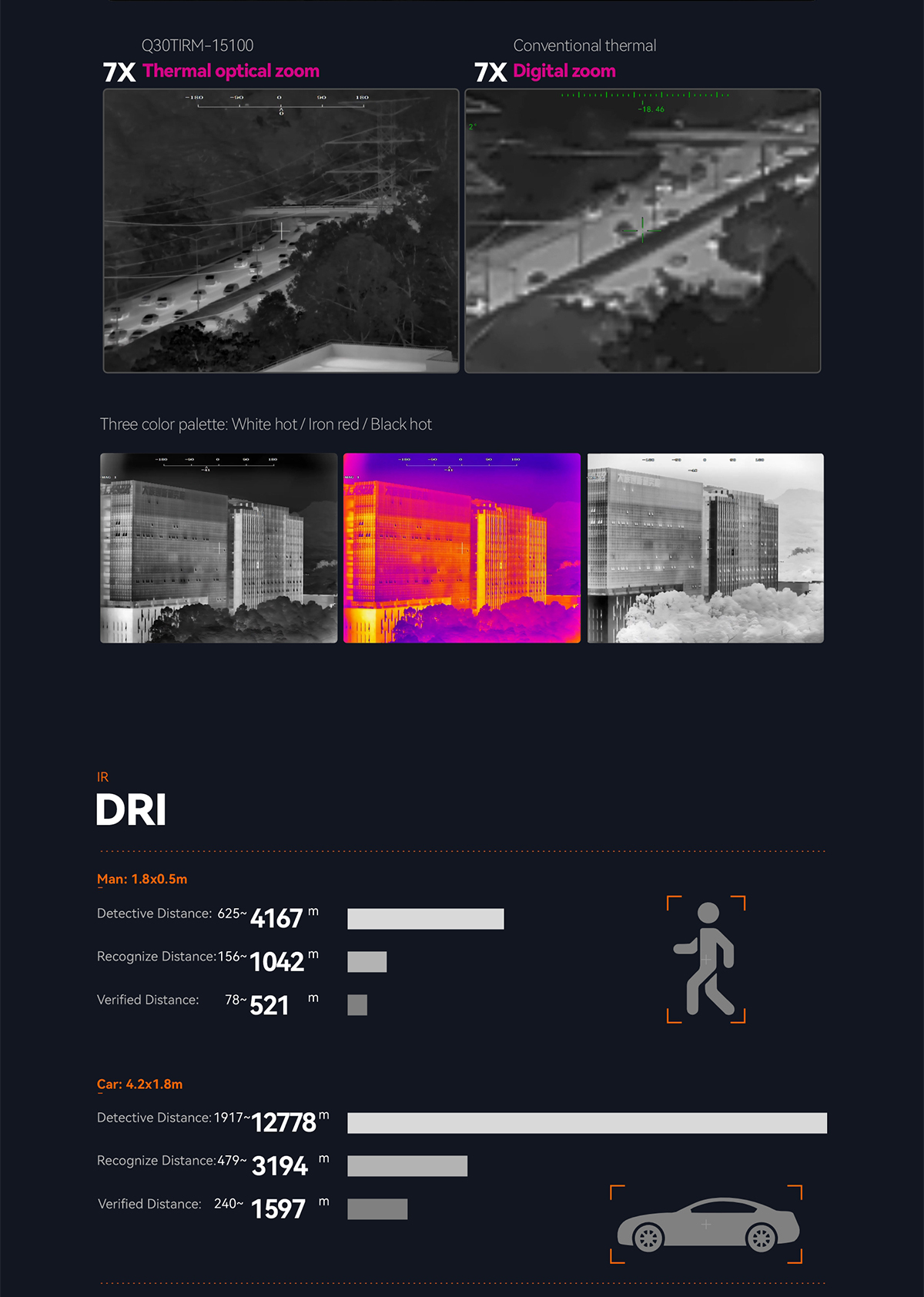 | 15~100mm Detective Distance (Car: 4.2x1.8m) | 1917~12778 meters |