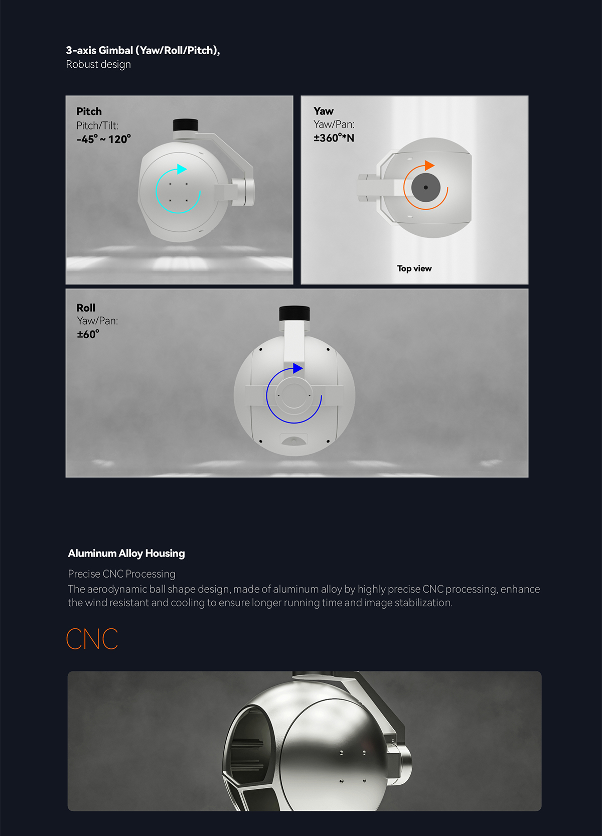 | Mechanical Range | Pitch/Tilt:-55°~105°, Roll: ±60°, Yaw/Pan: ±360°*N |