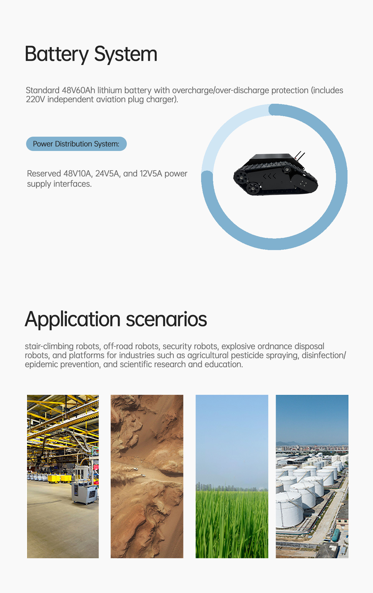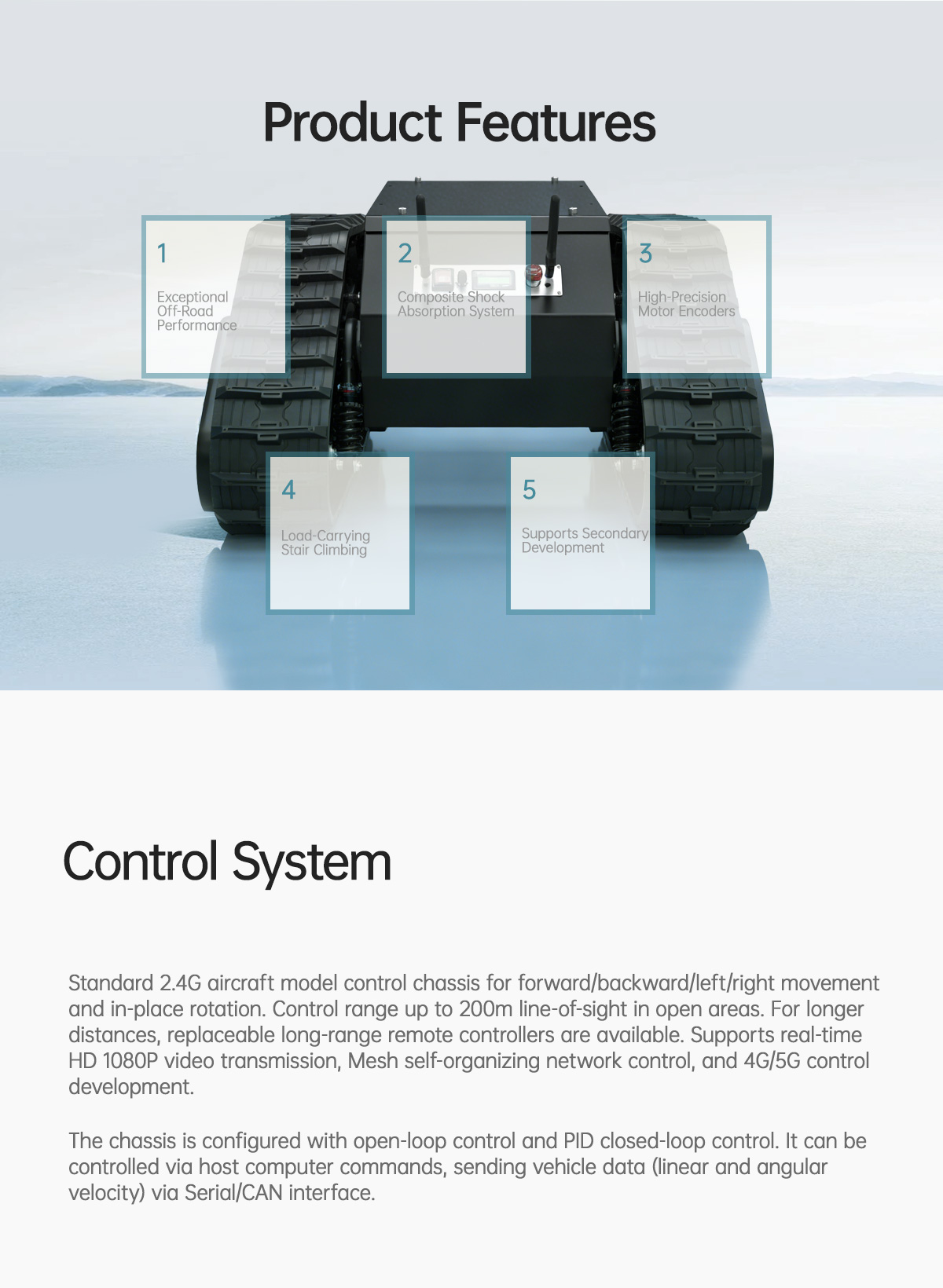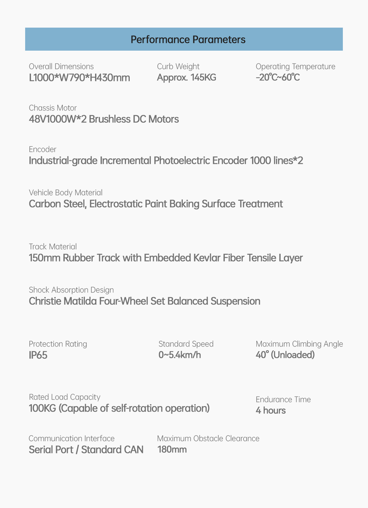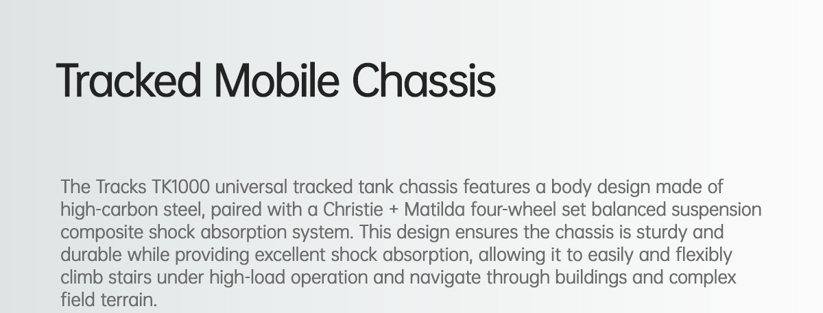 The Tracks TK1000 universal tracked tank chassis features a body design made of high-carbon steel, paired with a Christie + Matilda four-wheel set balanced suspension composite shock absorption system. This design ensures the chassis is sturdy and durable while providing excellent shock absorption, allowing it to easily and flexibly climb stairs under high-load operation and navigate through buildings and complex