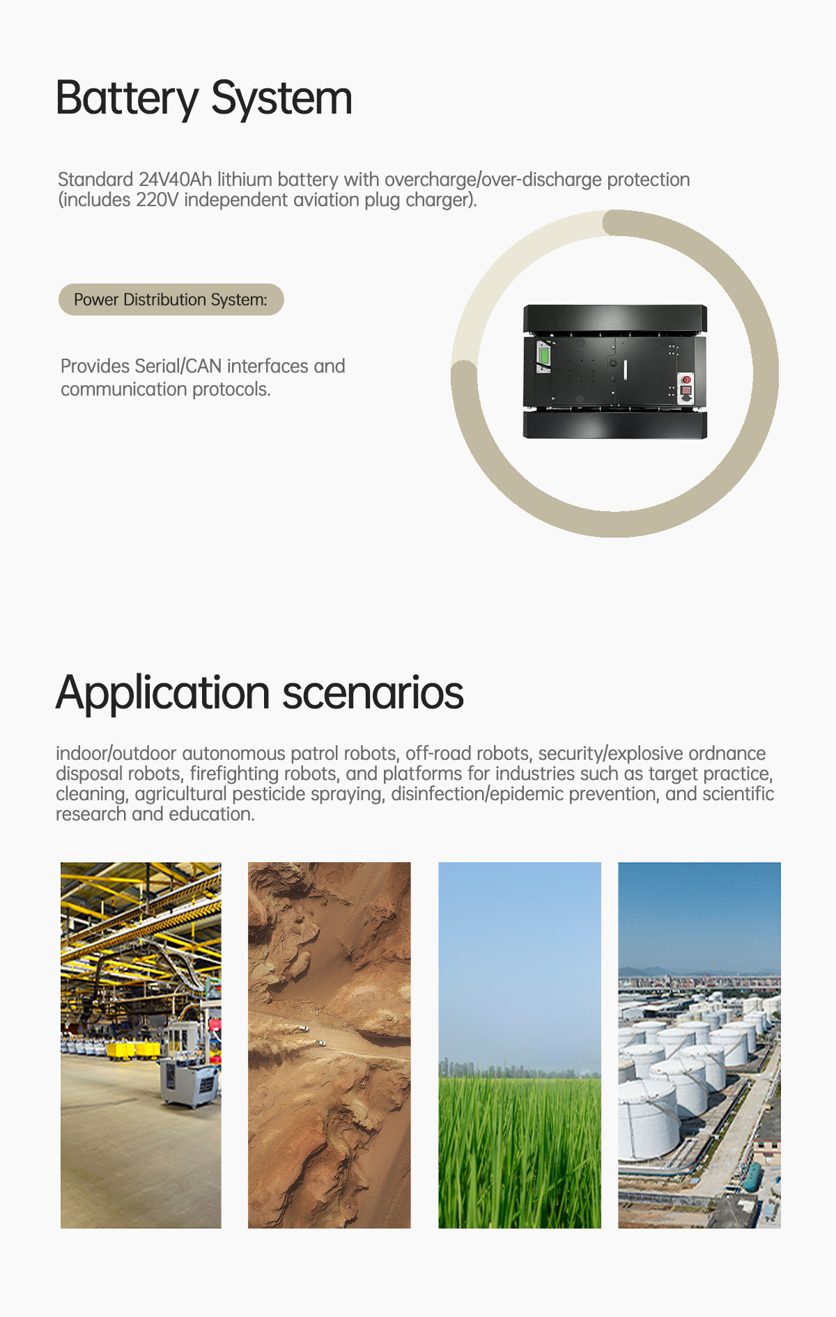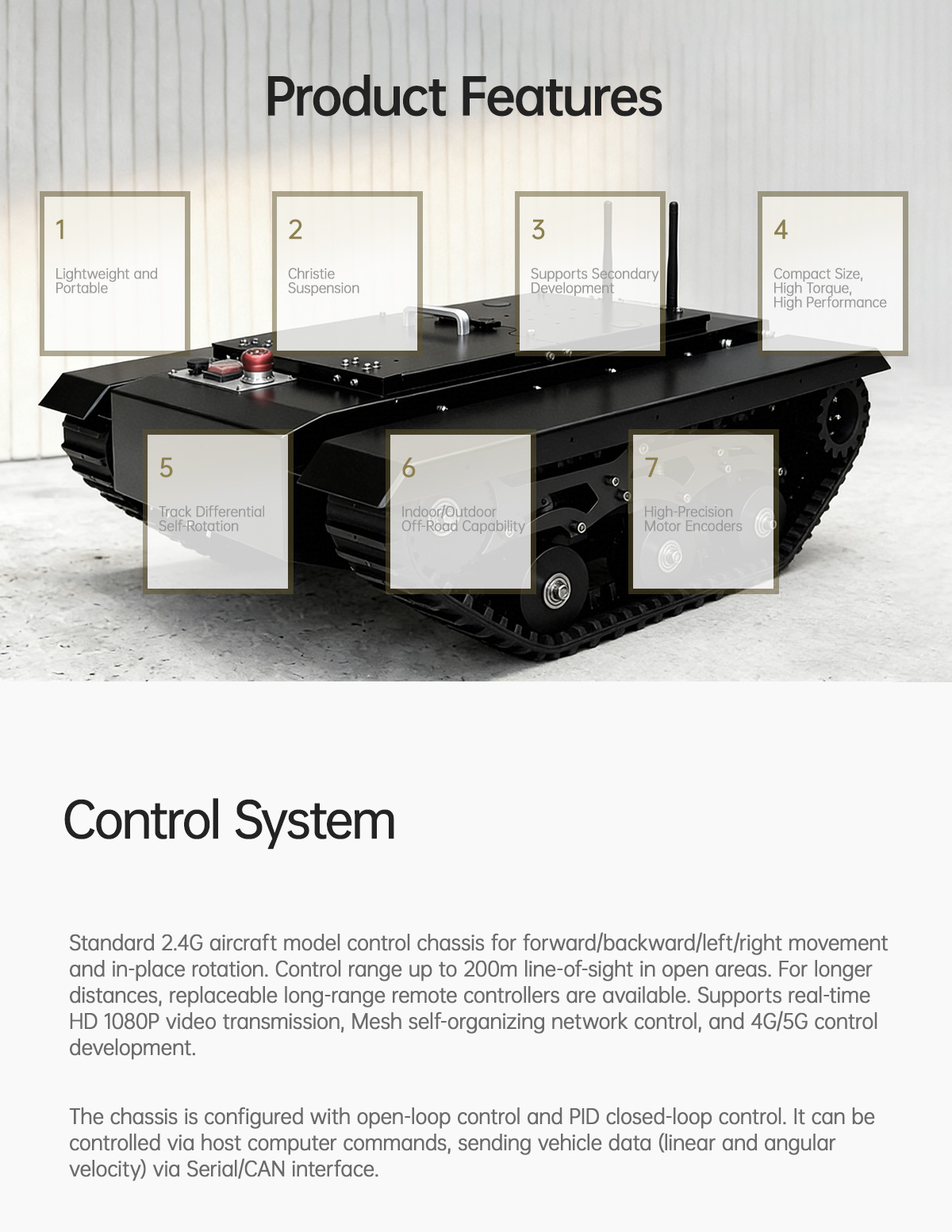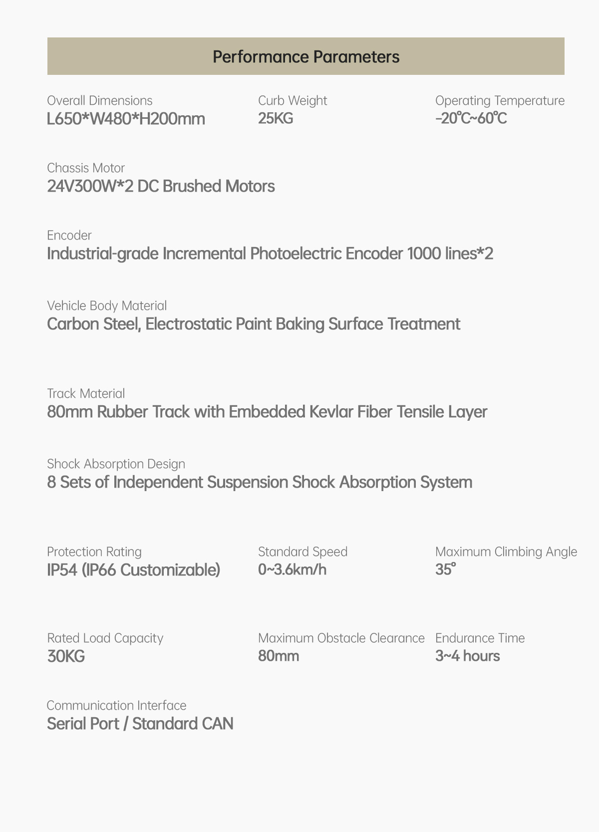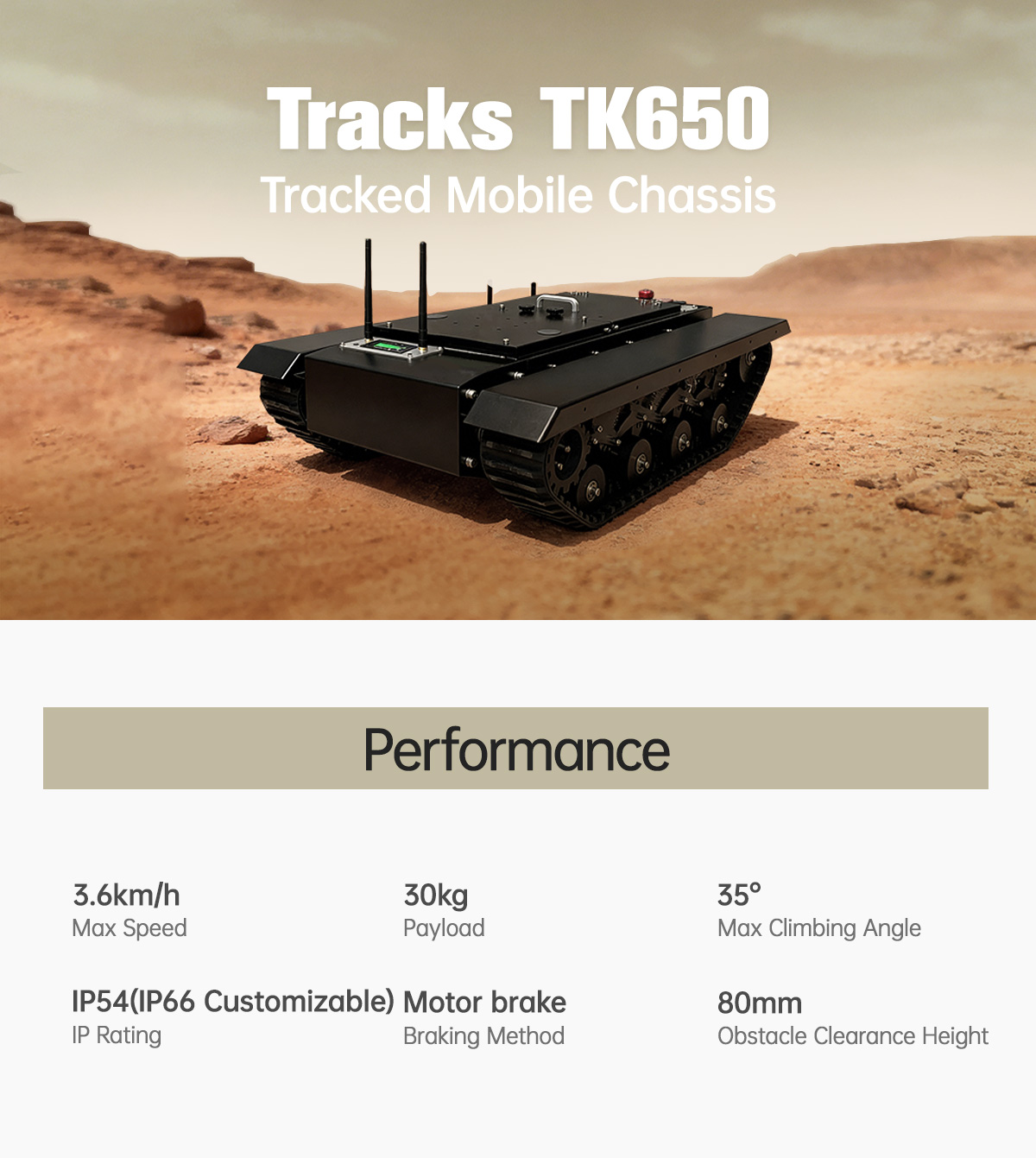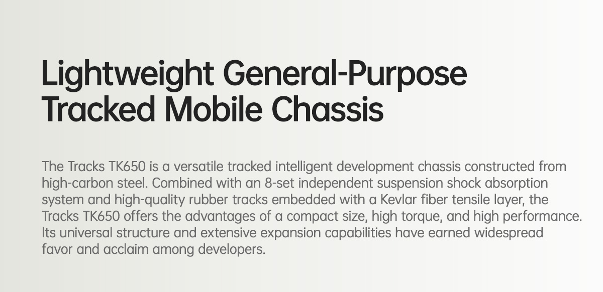 The Tracks TK650 is a versatile tracked intelligent development chassis constructed fromhigh-carbon steel. Combined with an 8-set independent suspension shock absorptionsystem and high-quality rubber tracks embedded with a Kevlar fiber tensile layer, theTracks TK650 offers the advantages of a compact size, high torque, and high performance.