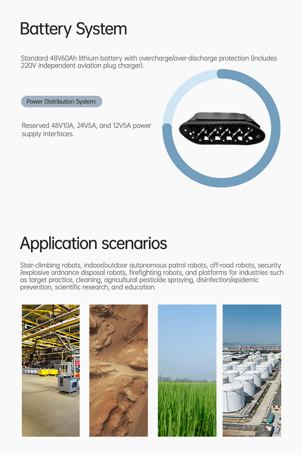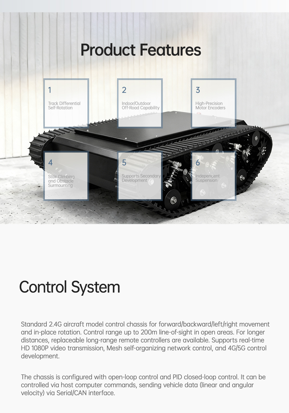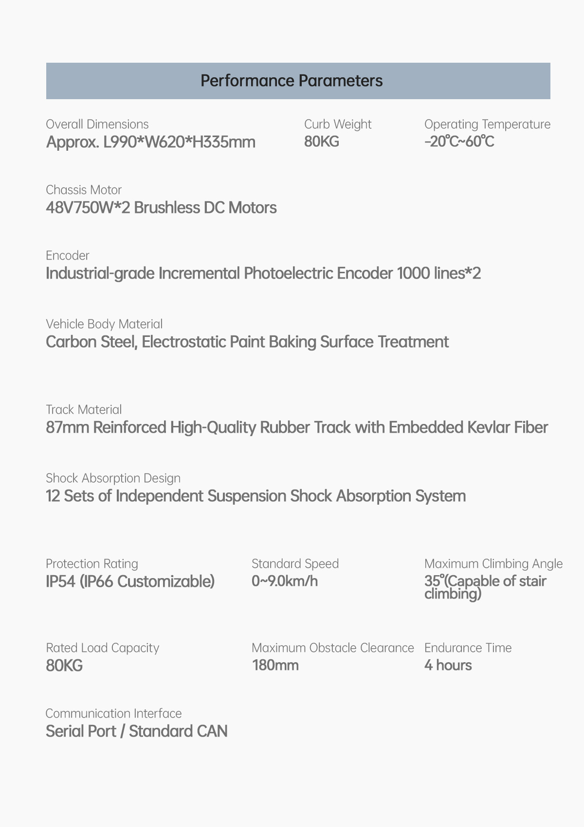 80kg Payload | 35°Max Climbing Angle | Motor brake 180mm | Obstacle Clearance Height; The chassis is configured with open-loop control and PID closed-loop control. It can be controlled via host computer commands, sending vehicle data (linear and angular velocity) via Serial/CAN interface.