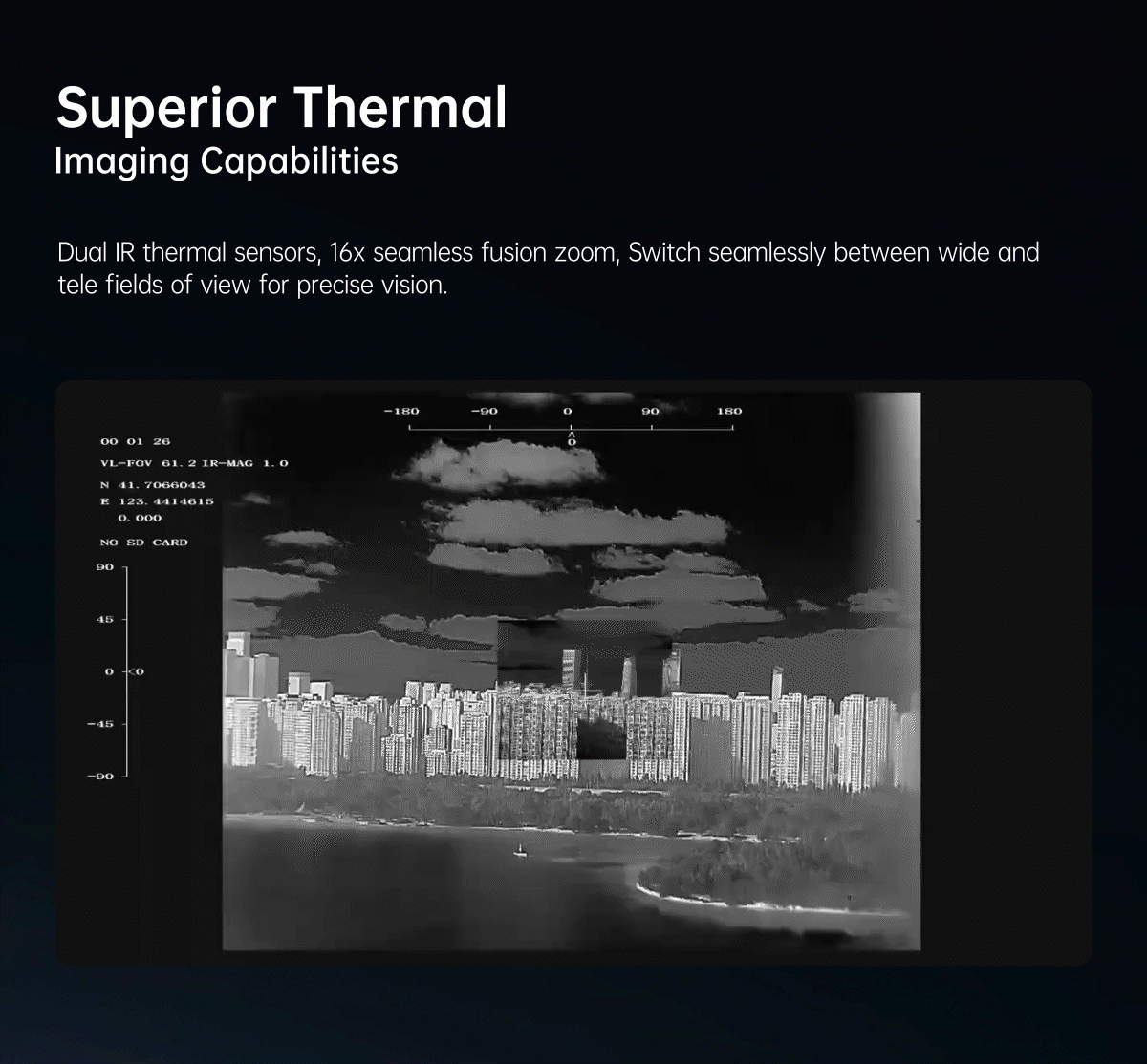 | OSD | Display the gimbal’s yaw and pitch angle, magnification, ranging value, card recording duration, aircraft GPS and altitude or target ranging point GPS and altitude (choose one of them, target point GPS and altitude as default), date and time |