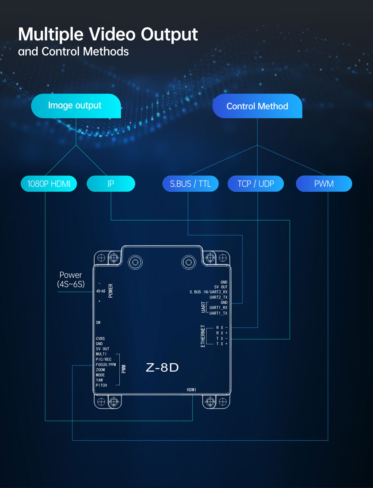 | Control method | PWM / S.BUS / UART (TTL) / TCP / UDP |